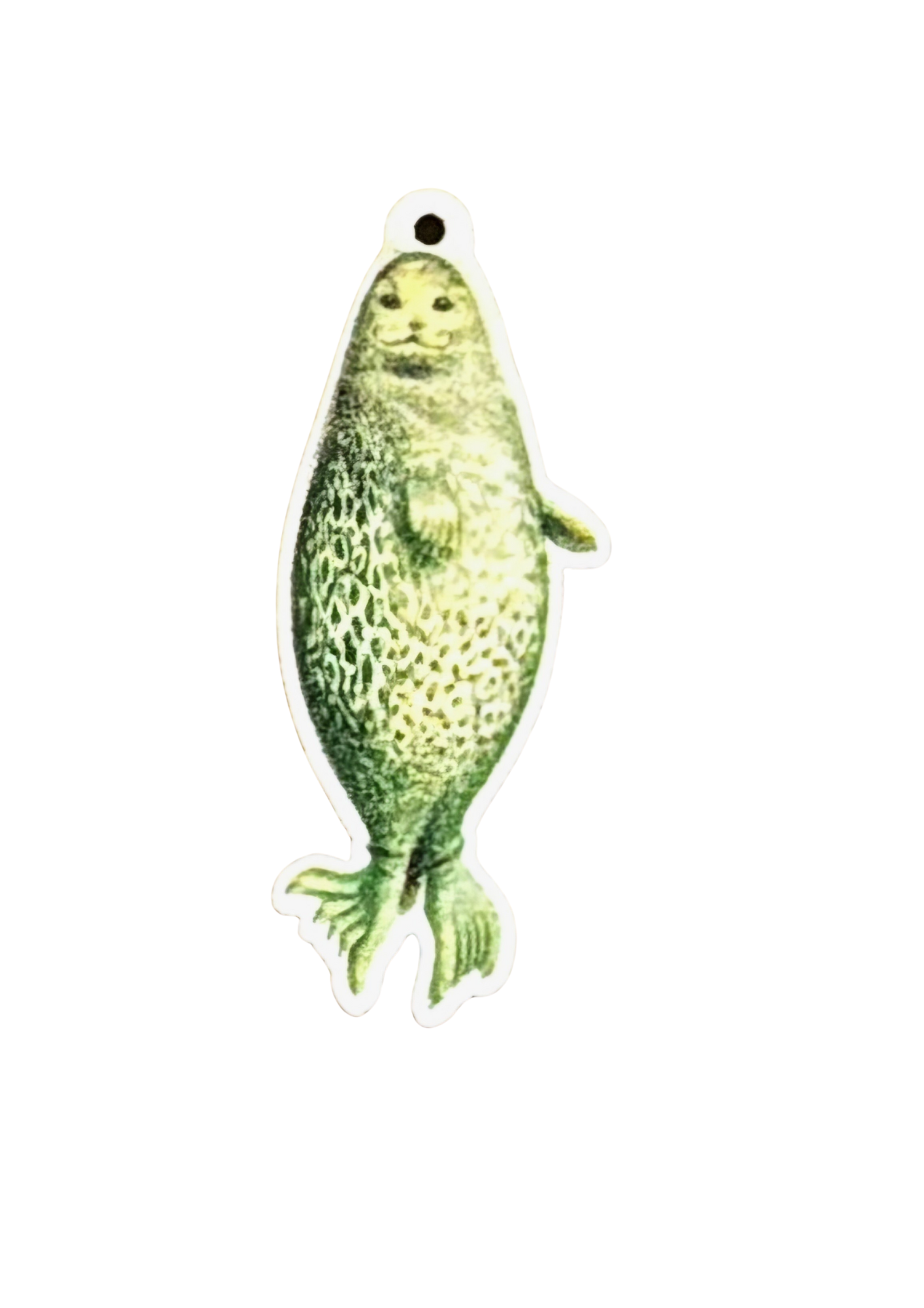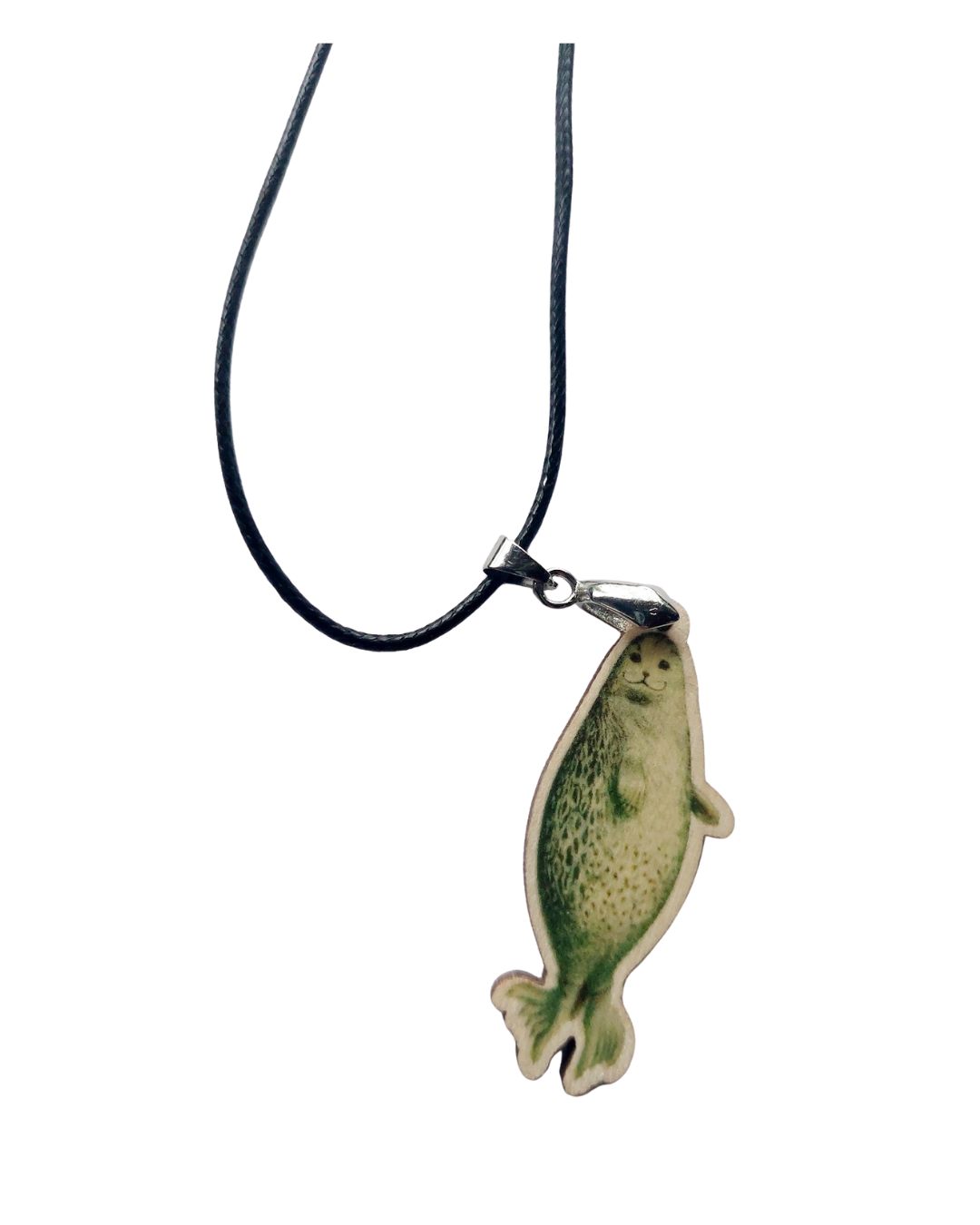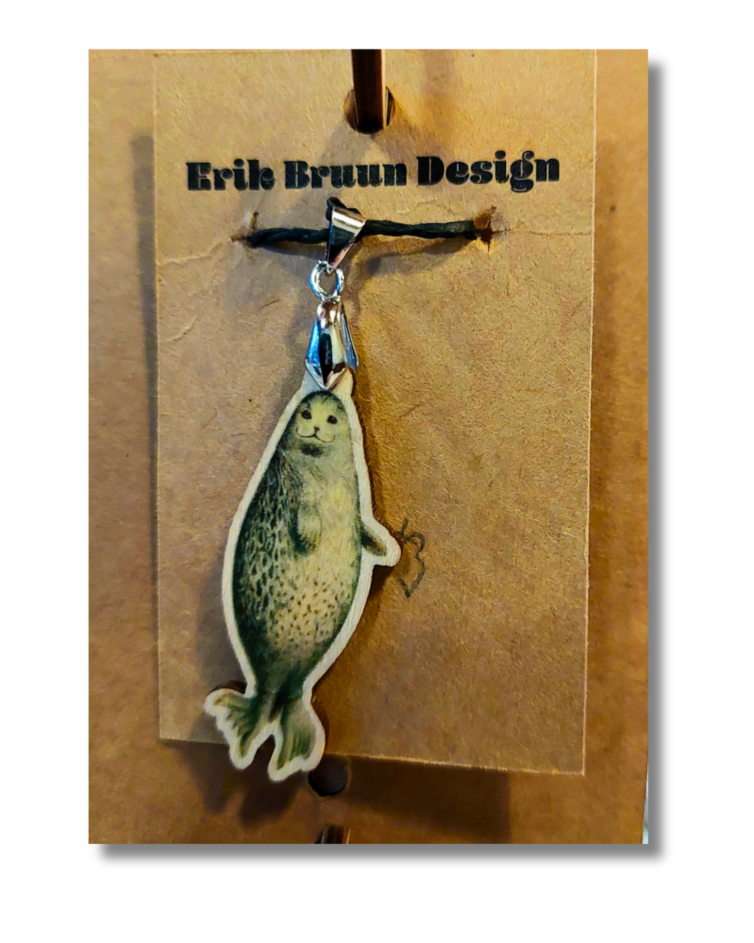 Suloisuus ripustettuna. Saimaannorpan muotoinen riipus, vaneria,  k. 4,5 cm, l. 2.5 cm, p. 3 mm.Hopean väriset korunosat. Kevyt ja mukava käyttää arjessa tai juhlaan. Hinta sis.postituksen!